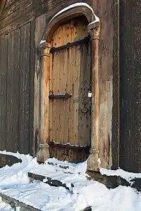 The majority of the building comes from the old Haltdalen Church in Haltdalen. That church had been expanded over its history and when the old church was moved to Trondheim, the "new" additions were not kept and the building was restored to its medieval look. This meant that the entire western wall of the building and the western portal needed to be replaced because they were taken down during one of the church additions. Rather than rebuilding from new on that part of the church, the western wall and the portal from the old Ålen stave church were used. That church had been torn down around the same time as this building and they were both similar in age and design.[2][3][4]