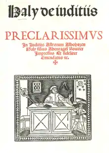 In 1485 at Venice a complete copy of the Old Castilian manuscript was translated into Latin and published by Erhard Ratdolt as Praeclarissimus liber completus in judiciis astrorum ("The very famous complete book on the judgment of the stars"). This printing (and later Latin versions) is commonly known as De iudiciis astrorum (or De judiciis astrorum).[3]