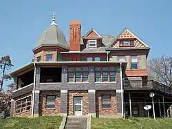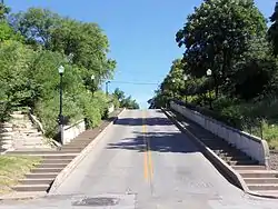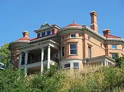 The geographical location of the Hamburg District is a fairly steep bluff north of the downtown area. The sidewalk on Ripley Street is replaced by steps as it climbs the hill. The area has the largest concentration of historically significant houses in Davenport.[8] As with other areas of the city, the simple Greek Revival style was the first to appear in Hamburg. These homes are generally at the base of the hill. The style is realized in cottages and the more popular two-story, 3-bay front gable homes. Other homes in the district include large Victorian homes in the Gothic Revival, Second Empire, Italianate, and the Queen Anne styles built in the 19th century. Many of these homes crown the bluff and offer vistas overlooking the river valley below. There are also examples of early 20th century Georgian Revival and American Craftsman homes. The historic district is rounded out by smaller and more simple late 19th and early 20th century homes and a few modern dwellings.