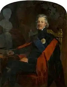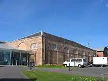 The first of these buildings, now known as Portland, was designed by the architect James Smith and built in 1696 as the private home of David Crawford, secretary and lawyer to Anne Hamilton, 3rd Duchess of Hamilton, and was sited near the foot of the 'Hietoun' close to the precincts of Hamilton Palace.[3] It is believed to be the oldest surviving building in Hamilton.[4] To the rear of the building is an assembly room and fives court, added after the 8th Duke bought the house in 1784. The house subsequently became a coaching inn on the London to Glasgow road, until the road was realigned in the 19th century. From 1835 the inn became the Duke of Hamilton's estate offices.[4] The building was then purchased by Hamilton Burgh Council in 1964 and subsequently made into the museum that now stands today.[3] The second building is the former Palace Riding School, built in 1837 by Alexander Hamilton, 10th Duke of Hamilton, to designs by William Burn to replace the stables court within the Hamilton Palace complex.[5] The Riding School building became the regimental museum of the Cameronians (Scottish Rifles) in 1983. A refurbishment project in 1993 added new linking buildings and an entrance to the combined museums, which are category A listed for their national importance.[4]