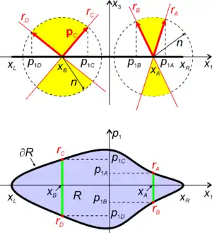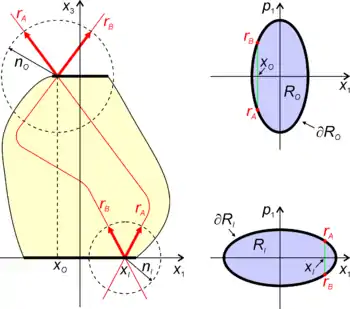 As such, ray rD shown at the top is represented by a point rD in phase space at the bottom. All rays crossing axis x1 at coordinate xB contained between rays rC and rD are represented by a vertical line connecting points rC and rD in phase space. Accordingly, all rays crossing axis x1 at coordinate xA contained between rays rA and rB are represented by a vertical line connecting points rA and rB in phase space. In general, all rays crossing axis x1 between xL and xR are represented by a volume R in phase space. The rays at the boundary ∂R of volume R are called edge rays. For example, at position xA of axis x1, rays rA and rB are the edge rays since all other rays are contained between these two. (A ray parallel to x1 would not be between the two rays, since the momentum is not in-between the two rays)