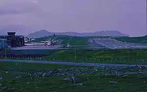 The terminal has a capacity for 250 passengers per hour. It includes a separate area for helicopter traffic, but this is not in use, and helicopter passengers instead use the regular part of the terminal. There is a separate operations and fire station building, which includes the control tower.[18] The asphalt runway measures 880 by 30 meters (2,887 by 98 ft) and aligned 05–23.[1] There are no possibilities of extending the runway, largely because of the terrain at the east end.[19] The tarmac has room for five aircraft the size of Dash 8, in addition to helicopters.[18] The airport is six to seven minutes' drive from the town center and has parking, taxis and car rental.[20] Forty-five people work at the airport.[19]