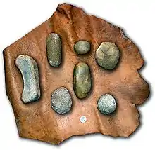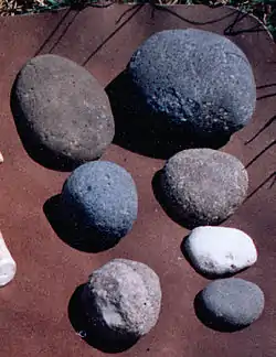 In archaeology, a hammerstone is a hard cobble used to strike off lithic flakes from a lump of tool stone during the process of lithic reduction.[1] The hammerstone is a rather universal stone tool which appeared early in most regions of the world including Europe, India[2] and North America. This technology was of major importance to prehistoric cultures before the age of metalworking.