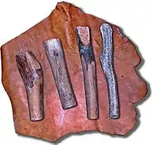 The opposite case is that of the Valladolid reservoir of Los Cercados (municipality of Mucientes). There, a series of Copper Age finds appeared, basically wells filled with archaeological remains. One of them produced a series of utensils typical of an artisan, specialized in the carving of indigenous flint: carving waste, roughing products, flakes, discarded tools, and above all stone hammers and what have been called bone retouchers (this type of pieces are rarely preserved, that's why they are so important). Apparently in this site they specialized in foliaceous pieces, for example arrowheads, and sickle teeth;[17] that is, it was a regional production destined for domestic use.