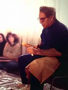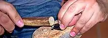 There is a method of pressure retouching, called subparallel covering retouching (due to its morphological aspect), which was rediscovered by the American archaeologist and experimenter Donald E. Crabtree in the 70s,[14] and expanded by this same archaeologist with the collaboration of Butler, Tixier and others. They have also developed many others, but this type of retouching is quite well known (In fact, many enthusiasts manufacture and sell highly accurate replicas in memory of the Native American heritage of certain regions[15]) and the interest from researchers, experimental prehistorians, has gone to the extraction of blades by pressure. To carry out this technique, the piece must be held firmly on the palm of the left hand (holding the lithic artifact firmly is one of the most difficult techniques to learn). The compressor is held with the right or it is levered while holding the left hand between the thumb and the rest of the fingers, pressing as hard as possible. The compressor can be made of horn or ivory (sometimes with a flint embedded in the tip[8]), but in Chalcolithic, which must be considered the golden age of this type of retouching due to the masterpieces obtained, the compressor could have a copper tip. If the technique is done well, the touches are usually very regular, parallel, and very flat over all.