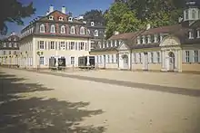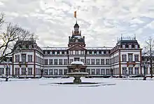 Friedrich Casimir died in 1685. His inheritance was divided between his two nephews, count Philipp Reinhard, who inherited Hanau-Münzenberg and count Johann Reinhard III, who inherited Hanau-Lichtenberg. Both were sons of Friedrich Casimir's brother Count Johann Reinhard II. So Hanau-Münzenberg was on his own again. It was then still in a phase of recovery from the devastations of Thirty Years' War but also some remarkable achievements took place. There was a lot of public building, for government, including Philippsruhe Castle, and church: In lots of villages a second, Lutheran church was erected and often called Reinhardskirche (de) after the reigning count.[19]