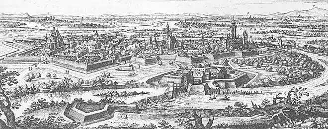 Also under the reign of Philipp II started the project to replace the mediaeval fortifications of the town of Hanau by the latest in Renaissance-fortification available. This investment became necessary due to the introduction of modern artillery the mediaeval fortification could not withstand. The new walls were placed outside the mediaeval ones and included a settlement, "Vorstadt", which had developed outside the gates.[5]