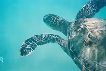 About 400 species of fish are known to inhabit the bay.[6] Hanauma Bay is known for its abundance of Green sea turtles, Chelonia mydas, known as Honu. Hanauma is a nursery ground for the immature turtles, which have their nesting grounds at French Frigate Shoals.[7] It is also known for its abundance of parrotfish.