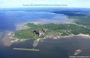 The Hanhikivi Nuclear Power Plant (Finnish: Hanhikiven ydinvoimalaitos, Swedish: Hanhikivi kärnkraftverk) is a nuclear power plant proposed for construction on the Finnish Hanhikivi peninsula, in the municipality of Pyhäjoki. It was planned to house one Russian-designed VVER-1200 pressurised water reactor, with a capacity of 1200 MW.[2][3] It was estimated that the reactor would supply 10% of Finland's energy demand by 2024.[4] The power company Fennovoima announced in April 2021 that construction of the plant would begin in 2023 and commercial operation would start in 2029.[1] In May 2022, Fennovoima terminated its contract with Rosatom to build the power plant.[5]