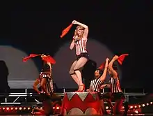 "Hanky Panky" was first performed on Madonna's third concert tour, the Blond Ambition World Tour of 1990. She performed the song dressed in a green and white striped vaudeville-style corset, playing the part of a nightclub singer, standing in front of a microphone. Near the end of the performance, Madonna joked: "You all know the pleasures of a good spanking, don't you? [...] When I hurt people, I feel better, you know what I mean?".[53][54] Regarding the "shameless promotion" of Dick Tracy in this segment, author Lucy O'Brien said that "along with her yen for artistic expression, Madonna has always had an eye on the bottom dollar... [But] the Dick Tracy section is the least dynamic part of the show".[55] Two different performances were released on video, the first was included in Blond Ambition Japan Tour 90, taped from the performance at Yokohama Stadium in Yokohama, Japan, on April 27, 1990,[56] and the other once included on Blond Ambition World Tour Live, taped at the Stade de l'Ouest in Nice, France, on August 5, 1990.[57]