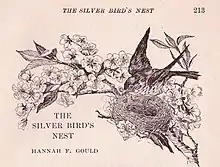 Hannah Flagg Gould (September 3, 1789 – September 5, 1865) was a 19th-century American poet. Her father had been a soldier in the American Revolutionary War, and after her mother's death, she became his constant companion, which accounts for the patriotism of her earlier verses.[1] Gould's poems were short, but they were frequently nearly perfect in their kind. Nearly all of them appeared originally in annuals, magazines, and other miscellanies, and their popularity was shown by the subsequent sale of several collective editions.[2] Her work exercised a helpful influence in its day, but lacked staying qualities. The high-water mark of her verse was reached in the poem entitled "A Name in the Sand".[3]
