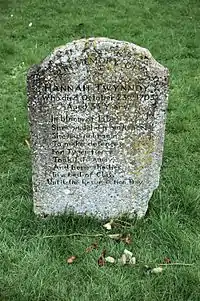 Her death is recorded in the Malmesbury parish register, which records a burial on 23 October 1703 of "Hannah Twynney kild by a Tygre at ye White Lyon".[1] Her gravestone survives in a corner of the churchyard of Malmesbury Abbey, with a memorial poem alluding to her death. A memorial plaque with more details was recorded by an antiquarian in the nearby village church at Hullavington, but is now lost.
