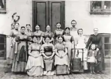 Nielsen was born on a farm in Søllerød near Copenhagen on 11 September 1829,[1] close to the farm where she lived in 1902. She married Hans Nielsen when she was 19 years old and they lived in a home named Havarthigaard. Nielsen and her husband sold milk from their cows, but she was unhappy with the profit from the milk so she sold it as butter and cheese.[2] Although Nielsen's attempts at selling butter and milk were successful from the beginning, she was not happy with the final products and decided to educate herself on better methods.[3] Other farmers' wives were able to produce similar butter and cheese, but Nielsen wanted hers to be better than theirs. She studied subjects relating to dairy produce and traveled to Norway, Sweden, Switzerland and France, among others, to learn how to obtain better results.[2] Nielsen learned how to make cheddar cheese with Joseph Harding in England, brie and Roquefort in France, and Gouda cheese along with Edam cheese in the Netherlands.[3]