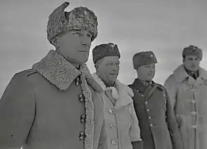 ![]() Hannuksela with his staff on the Karelian Isthmus, January 1942 | |
