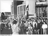 Joachim Spremberg was born in Berlin late in 1943. After leaving school he trained as a film copying technician, a preparation to becoming a photo-journalist. He started work with the Pictures Department of the state news agency (Allgemeiner Deutscher Nachrichtendienst / ADN) in 1964. Here he quickly and single-mindedly started photo-reporting significant events.[2] Along with daily life he documented the construction of the Berlin Television Tower and was frequently employed at important national events, including some involving the national leader, Walter Ulbricht.