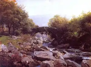 Many of Gude's peers moved on from the Academy in Düsseldorf to other art institutes, but Gude decided to seek more direct contact with nature.[3] Gude had gained a foothold in the British art market in the 1850s after his works were accepted into the galleries of Francis Egerton, 1st Earl of Ellesmere and the Marquess of Lansdowne, and so when an English art dealer and former student of Gude – Mr. Stiff – suggested Gude might find success in England, he was quick to respond.[3] In the autumn of 1862 Gude set off for the Lledr Valley near Conwy. Wales, a place renowned for its picturesque scenery, was already home to a colony of British plein-air artists.[3] While small groups of artists living in the countryside in order to inspire each other, be closer to their subject and escape the city were common, Gude was one of the first Norwegian artists to live in such a manner.[3] Gude rented a house overlooking River Lledr where he painted one of the ancient Roman bridges which was popular with artists of the time.[3]