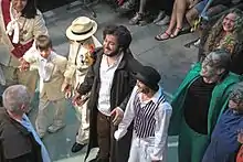From 1968 to 1979 Heyme was the artistic director and dramaturge of the Schauspiel Köln (Cologne's principal theatre). At Cologne he concentrated on works by the classic German playwrights, Schiller, Goethe, and Hebbel and on ancient Greek tragedies and comedies, his "Antiquity Project". The project produced some of the first performances in Germany of Euripides' The Bacchae and Aristophanes' The Frogs.[9] As in Wiesbaden, Heyme's productions of both classic European dramas and ancient Greek plays were marked by their radical modernization which made reference to contemporary political and social issues. It was during this period that Heyme coined the term "subventionierte Opposition" ("subsidized opposition") to describe his vision of modern theatre. His last production for Cologne was a controversial Hamlet designed by the video and installation artist Wolf Vostell.[2][10] The final scene of the Heyme-Vostell production depicted the dead Hamlet, Claudius, Gertrude, and Laertes lying naked on metal trolleys with their intestines on top of their bodies. Behind them newsreaders drone on flickering television screens while a dwarf repeatedly spins around Hamlet's trolley.[11]