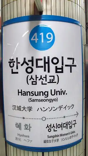 Hansung University Station (Korean:한성대입구역) is a station on the Seoul Subway Line 4. It is also called Samseongyo Station.[2][1] The university with the same name is about a half-mile away from this station. The Holy Spirit Campus of the Catholic University of Korea is located closer, to the southwest.