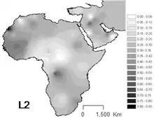 L2 is a common lineage in Africa. It is believed to have evolved between 87,000 and 107,000 years ago[4] or approx. 90,000 YBP.[1] Its age and widespread distribution and diversity across the continent makes its exact origin point within Africa difficult to trace with any confidence.[5] L2 Haplotypes is commonly observed in Central & South Eastern African populations, finding shared genetic matches with South East Africa and Central Africa.[6] An origin for L2b, L2c, L2d and L2e is South Eastern Africa seems likely.[5] The early diversity of L2 can be observed all over the African Continent, but as we can see in Subclades section below, the highest diversity is found in South East Africa. Most of subclades are largely confined to western-Central Africa.[7]