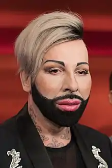 Harald Glööckler, real name Harald Glöckler[1] (born 30 May 1965[2] in Maulbronn), is a German fashion designer[3] and entrepreneur, who became famous mainly for his rhinestone-studded and glittering creations.[4] Glööckler's trademark is a crown motif, which is often supplemented by a "POMPÖÖS" lettering.