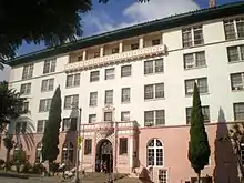 The Army and Navy Y.M.C.A. was dedicated in 1926 as a recreation center for servicemen at Fort MacArthur, offering 300 dormitory rooms, a gymnasium, running track, banquet room, patio, pool, boxing and wrestling rooms and a coffee shop. It provided recreation and temporary quarters for over four million men during World War II, and was visited by celebrities, including Bob Hope and Lucille Ball.[2]