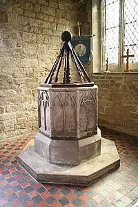 The font is from the Decorated period and presumably stood in the pre-Reformation position by the front door, in line with Catholic practice. The date 1606 may indicate when it was moved. After the Reformation, the font was moved again into the centre of the church and remained there until 1834. The font now stands in the northeast corner of the north aisle where the organ sat before the vestry was built in 1901.