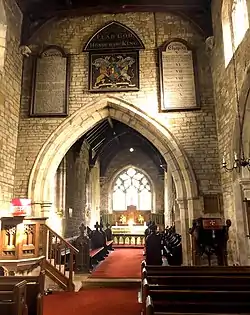 On the wall above the arch at the east end of the nave are four panels. The middle two are wooden boards. One has the coat of arms of George II (reigned 1727–1760). The board above bears the inscription "Fear God, Honour the King". The other two panels show the ten commandments on canvas in wooden frames.