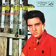 "Hard Headed Woman" is a rock and roll song recorded by Elvis Presley and published by Gladys Music, Presley's publishing company, in 1958. It is an American 12-bar blues written by African American songwriter Claude Demetrius. It was most notably recorded as a rock and roll song by Presley as part of the soundtrack for his 1958 motion picture King Creole, and was included on the record album of the same name. The song was also released as a single in both 78 RPM[1] and 45 RPM formats. In 1958 it went to No. 1 on the Billboard charts and went to number two for two weeks on the R&B chart.[2] It became the first rock and roll single to earn the RIAA designation of Gold Record.