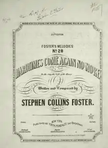 "Hard Times Come Again No More" (sometimes, "Hard Times") is an American parlor song written by Stephen Foster. It was published in New York by Firth, Pond & Co. in 1854 as Foster's Melodies No. 28. Well-known and popular in its day,[1] both in America and Europe,[2][3] the song asks the fortunate to consider the plight of the less fortunate and includes one of Foster's favorite images: "a pale drooping maiden".