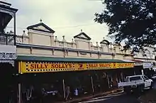 Like other post-fire buildings in Childers this set of 5 shops were masonry rather than timber, a choice no doubt influenced by the fire, and were elegant single story buildings with large glass shop fronts. Striped ogee awnings across the footpath were supported by decorative posts with cast iron infill. Each shop had a separate roof, some lit by lanterns and the individual tenancies were also marked by the visual separation of the facades by the use of classic revival pediments, urns, and balustrades. Although this row of shops was designed as five tenancies, two were owned by Albert Gorrie, who conducted a bakery in one and leased the other, and three by Thomas Gaydon, which were occupied as a single tenancy by Wyper Brothers, ironmongers, who also sold furniture and hardware. Pettigrew's Hardware who succeeded them in the 1920s, also used all of the Gaydon owned space, which practice seems to have continued. Although the building has now changed hands several times it has been a hardware store for most of its commercial life. It became Silly Solly's in early 1996.[1]