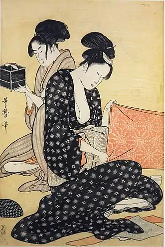 Ukiyo-e art flourished in Japan during the Edo period from the 17th to 19th centuries, and took as its primary subjects courtesans, kabuki actors, and others associated with the "floating world" lifestyle of the pleasure districts. Alongside paintings, mass-produced woodblock prints were a major form of the genre.[1] In the mid-18th century full-colour nishiki-e prints became common, printed using a large number of woodblocks, one for each colour.[2] A prominent genre was bijin-ga ("pictures of beauties"), which depicted most often courtesans and geisha at leisure, and promoted the entertainments of the pleasure districts.[3]