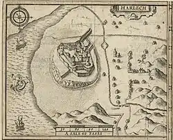 The exact derivation of the name "Harlech" is unclear. Some, mostly older sources derive it from Arddlech, i. e. ardd (high) + llech (rock),[8][9] referring to the prominent crag on which the castle stands. Recent sources prefer a simpler derivation from the two Welsh words hardd (fair/fine) and llech (slate/rock).[10]