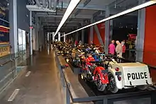 On the museum’s upper level, a procession of motorcycles is displayed down the center of the main hall, running the length of the building, with galleries on either side.[11]