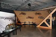 The Clubs and Competition gallery includes displays and information about Harley-Davidson's racing history. The gallery includes a section of a replica wooden board track, suspended in the air at a 45-degree incline. The wooden track features vintage video footage of actual board track races, and attached 1920s-era Harley-Davidson racing motorcycles; the bikes that raced on board tracks at 100 miles -per-hour. Fatalities were common, which led to the banning of wooden board tracks for motorcycle racing.[7]