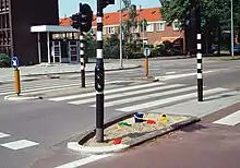 In 1992, De Hoop shifted his activities out of doors and became a pioneer of a new form of ‘street art’.[2] Inspired by artist like Keith Haring and Charles Simonds,[3] who worked in public space without being commissioned to do so, he started to think about the ways in which ‘art in public space’ could be re-defined.[4] He decided to address the passer-by without using the existing language of the art world. His interventions are made by re-contextualizing existing signs or objects, adding them to a location in an unexpected way and by doing so questioning ‘normality’. The work is often about the functionality of materials and objects, or about rules and regulations and the way people behave in the public domain.[5] Before he makes a work he visits and photographs an unlimited number of locations in a chosen city until he finds the right site for his intervention.