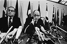 In Middle East affairs, Brown supported President Carter's efforts as an intermediary in the Egyptian-Israeli negotiations leading to the Camp David Accords of September 1978 and the signing by the two nations of a peace treaty in March 1979.[2][4] Elsewhere, the fall of the Shah from power in Iran in January 1979 eliminated a major U.S. ally and triggered a chain of events that played havoc with American policy in the region. In November 1979, Iranian revolutionaries occupied the U.S. embassy in Tehran and took more than 50 hostages. Brown participated closely in planning for a rescue operation that ended in failure and the loss of eight U.S. servicemen on April 24–25, 1980. Not until the last day of his administration, on January 20, 1981, could President Carter make final arrangements for the release of the hostages.[2][4]