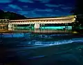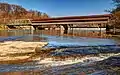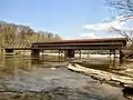 Harpersfield Bridge is a covered bridge spanning the Grand River in Harpersfield Township, Ashtabula County, Ohio, United States. This double-span Howe truss bridge, one of currently 17 drivable covered bridges in the county, is the third longest covered bridge in Ohio at 228 feet. A flood in 1913 washed away the land at the north end of the bridge, and the steel span was subsequently attached. The bridge features a walkway, added during its renovation in 1991-92. The bridge also features an Ashtabula County MetroPark at its north end, and is listed on the National Register of Historic Places.[1] The bridge's WGCB number is 35-04-19,[2] and it is located approximately 3.4 mi (5.5 km) south of Geneva.