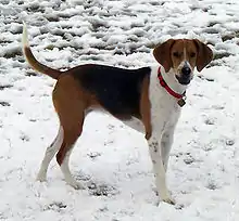 The Harrier is a medium-sized dog breed of the hound class, used for hunting hares by trailing them. It resembles an English Foxhound but is slightly smaller, though not as small as a Beagle. The breed has been used since the mid 13th century.
