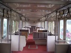 The trains had a saloon seating layout, divided into smaller sections by full-height partitions. They were provided with either two or three sets of hand-operated dual sliding doors per carriage side. Later sets were fitted with power doors. Interiors were split into smoking and no-smoking compartments until late 1978, with the abolition of smoking on trains,[15] and carriages were designated as First or Second class until 1958, when one class travel was introduced.[15] Most of the carriages were delivered without end gangways between carriages, but safety concerns led to these being added in the final five sets as delivered from mid-1966. These sets were also fitted with only two doors per carriage side rather than three, permitting additional seating and reflecting the increasing average travel distance.[1]