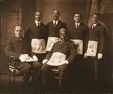![]() Harry A. Williamson (standing, far right) and five fellow members of the Carthaginian Lodge no. 47 | |