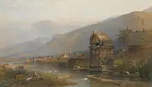 Johnson travelled in southern Europe, northern Africa and Asia Minor. He painted oil - and watercolour pictures (ruins of Sardis, the Acropolis in Athens, Temple of Athena in Aegina). In 1844 he was making one of a number of visits to Betws-y-coed in Wales - this time with David Cox of the Birmingham School who was known for painting landscapes.[2] He exhibited at the Royal Academy from 1845, and at other times in the next 35 years.[1] Johnson has watercolours in the Victoria & Albert Museum as well as paintings in collections in Bath, Sheffield and Birmingham.[3]