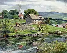 Early in 1934 Shokler and his wife, the author Dahris B. Martin, took a summer rental of a cottage in the village of South Londonderry, Vermont, and that fall he showed paintings of village landmarks in a group exhibition held by Southern Vermont Artists, Inc. in Manchester.[27][28] A decade later they bought a house in the village and, liking the locale and its inhabitants, soon made it their permanent residence.[29][30] The couple immersed themselves in local society, became active in village civic affairs, and increasingly sought ways to provide leadership in local and regional cultural activities.[31][32][33] In 1948 Shokler began restoring a dilapidated barn on the property. Using barter to obtain the materials and labor that were needed to complete the job, he constructed a combination studio, gallery, and classroom.[31] At first called the Barter Barn, the place eventually became known as the Shokler Art Studio.[32] Shokler used the building's gallery to display his own works and works produced by students who came there to learn art. He also made it available as a local and regional art center, hosting meetings of art groups and displaying works by amateur and professional artists of the area.[34]