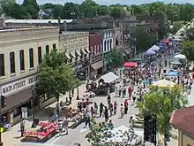 In July 1843, Timothy Hall became the first white person to purchase and settle land in the Hartford area, although when he arrived he found a Canadian named Jehial Case squatting near his land. Later that year, German immigrant settlers John Theil and Nicolaus Simon surveyed the Hartford area and determined that the Rubicon River would be a suitable location for a hydropowered mill. The following year, James and George Rossman joined Simon and Theil's venture. The men purchased forty acres abutting the rapids of the Rubicon River[9] and constructed a dam and a sawmill that harnessed the river's power to make lumber from the old-growth forests covering the area.[10] In 1846, a third Rossman brother, Charles, arrived in Hartford and constructed a gristmill to process grain grown by the settlers.[11] On January 31, 1846, the land incorporated as the Town of Wright, before the name was changed to the Town of Hartford in February 1847,[12] after Hartford, Connecticut. Many of the original settlers were Yankees from New England and were part of a wave of farmers who headed west in the early 1800s, though some other settlers—including Theil and Simon—were German immigrants. The early settlers cleared land for farming; constructed roads; created a post office;[13][14] erected churches, the first being the First Congregational Church of Hartford which formed in 1847, and was followed by Methodist, Baptist, Lutheran, and Catholic churches in the 1850s;[15] and established businesses to serve the town's agricultural economy, including equipment wholesalers, general stores, and dry goods dealers.[16]