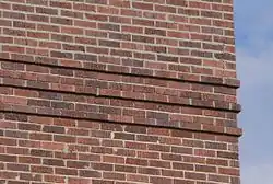 The central bay of the south facade of the Hartington City Hall and Auditorium is highly effective Prairie School architecture (the nearly hidden north facade is similar). The bulk of the wall surface is simple running bond brickwork, forming a uniform ground for the interplay of horizontal and vertical lines. The stone coping at the roofline forms the highest horizontal line. Not far below is a horizontal band of triple corbelling that surrounds the building. This effect is created by projecting three courses of brick out farther than the wall below (as in a corbel), repeating it with three more courses of brick, and then repeating it again for the entire rest of the wall up to the copestone. Steele adds depth and interest to this band by varying the projection of each of the three brick courses by facade so that corners highlight one or another course (see photo below). This effective horizontal band is similar to but more sophisticated than what Steele used near the top of his noted First Congregational Church (Sioux City, 1916–1918). Additional horizontal lines derive from the original three bands of windows (particularly prior to more recent window alterations). These consistent horizontal lines are dramatically emphasized by the strong counterpoint of the six vertical piers. Yet even these vertical pilasters have horizontal elements in their capitals, consisting of three horizontal bands of projecting brick string courses (which echo the triple corbelling above) and the contrasting capitals of cast stone on top. Across the set of six vertical piers or pilasters along the auditorium, these elements create additional horizontal lines.[12][23][27][30]