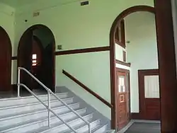 The Hartington City Hall and Auditorium includes three levels: raised basement partially below grade, main level, and upper level. The basement level and main level are basically rectangular in plan, 75 feet (23 meters) wide (north-south along Broadway) and 130 feet (40 meters) front to back (east-west along Centre). However, the upper level plan is in the shape of a cross, so that the four corners are one story lower and function as wings. The two front wings project forward toward Broadway as well as laterally (north and south). The two rear wings are flush with the back (east) of the building. The southeast wing projects south and contains the two fire house doors, but the northeast wing does not project north. The basement originally contained the armory including officers’ quarters, lockers, supply room, and sleeping facilities for fire fighters, with the firehouse in back under the auditorium stage. The main level accommodated the lobby and city offices in front, the auditorium's hardwood floor taking up the large middle, and the stage in back above the fire house. The cross-shaped upper level included a small space in front above the lobby and the stage fly space in back, but the bulk of it in the middle was simply open to the auditorium.[19][21][23]