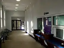 The station has a staffed ticket office, which is open from 07:25 to 18:20 Mondays through Saturdays (closed Sundays). A self-service ticket machine is also provided near the station entrance for use when the ticket office is closed and for collecting pre-paid tickets. Ticket barriers have been operation at the station since September 2017.[11] Train running information is offered via automatic announcements, digital display screens and timetable posters. There are toilets in the ticket office and a waiting room on the concourse, along with vending machines dispensing snacks and cold drinks. Step-free access is available from the entrance to the platforms.[12]