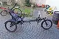 A recumbent two-wheeled Trets trailer bike on the back of a tandem