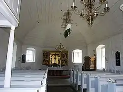 The vaulted ceiling was added in 1847. The carved triptych above the altar from the early 16th century depicts the crucifixion in the centre panel while the two-sectioned panel to the north shows Jesus being whipped and his appearance before Pontius Pilate and that to the right shows the crown of thorns and Jesus bearing the cross. Until 1847 the altarpiece had five panels and is believed to have come from Lübeck. The pulpit from the late 16th century is probably of Flemish origin. The organ gallery at the western end of the building dates from the 18th century. The 13th century Gotland limestone baptismal font has a wide flat bowl with a conical bottom while its sloping sides are decorated with pointed arches.[2][4]