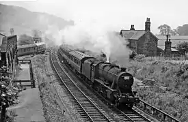 It was built for the benefit of the Duke of Devonshire of Chatsworth House who, having previously declined to allow the railway to pass over the easier terrain of his lands, belatedly saw its possible benefit.[3] Indeed, for a while it was renamed "Hassop for Chatsworth".[4] However, in this sparsely populated area, it saw little use, and closed in 1942. It greatest usefulness was as a goods yard, which closed in 1964.