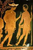 Ancient Greek statue of a lady with blue and gilt garment, a fan and a sun hat, from Tanagra, c. 325–300 BC.